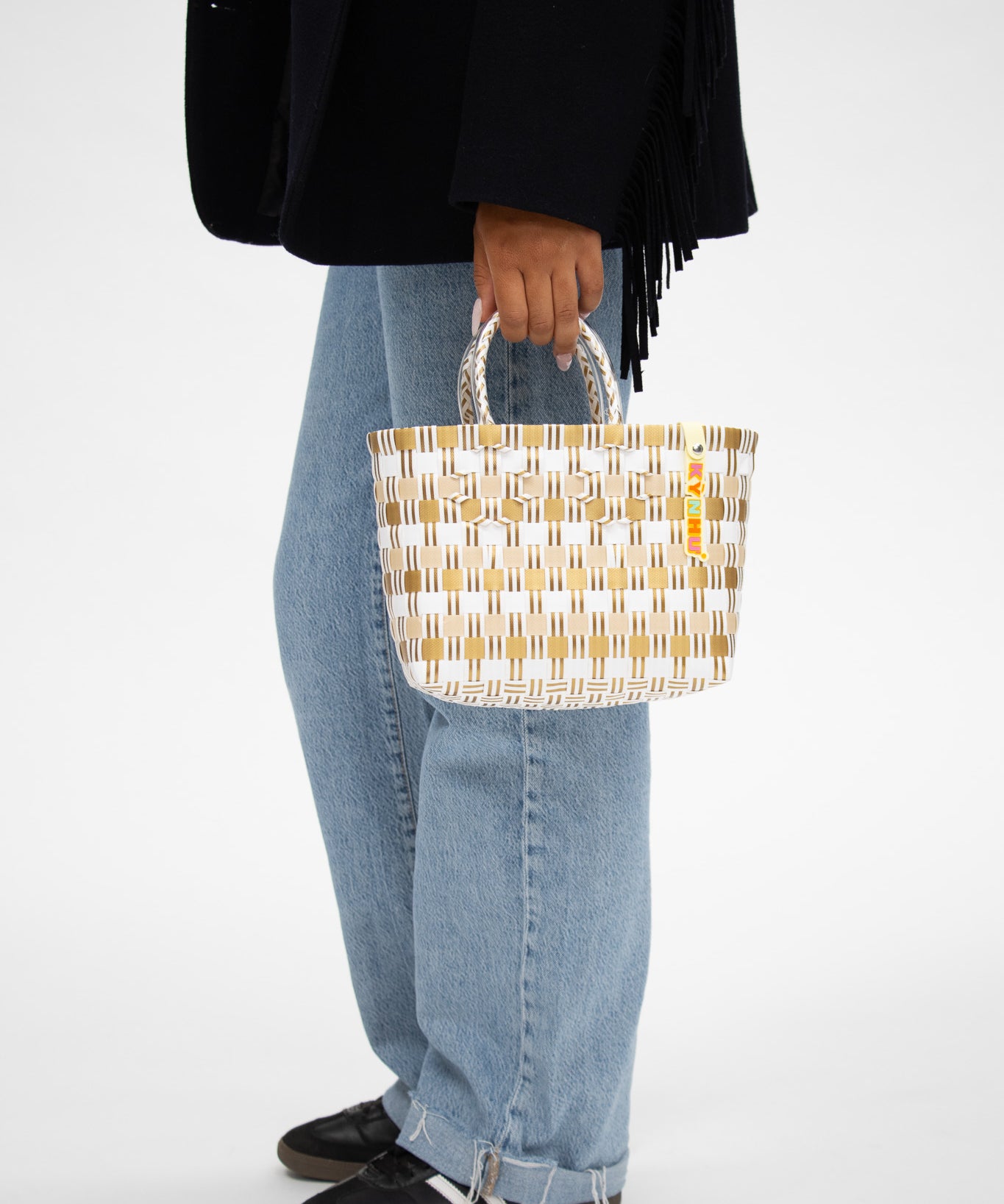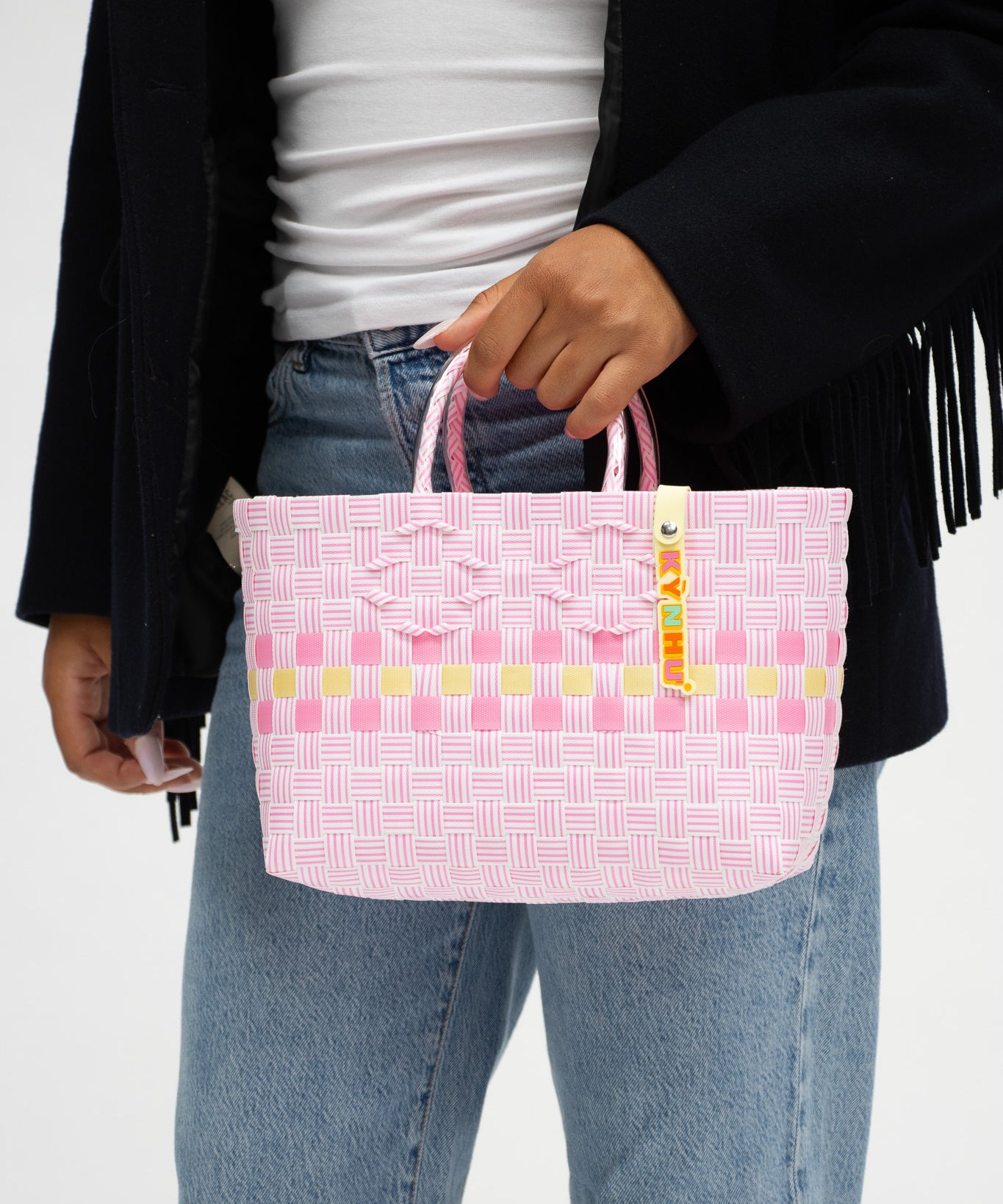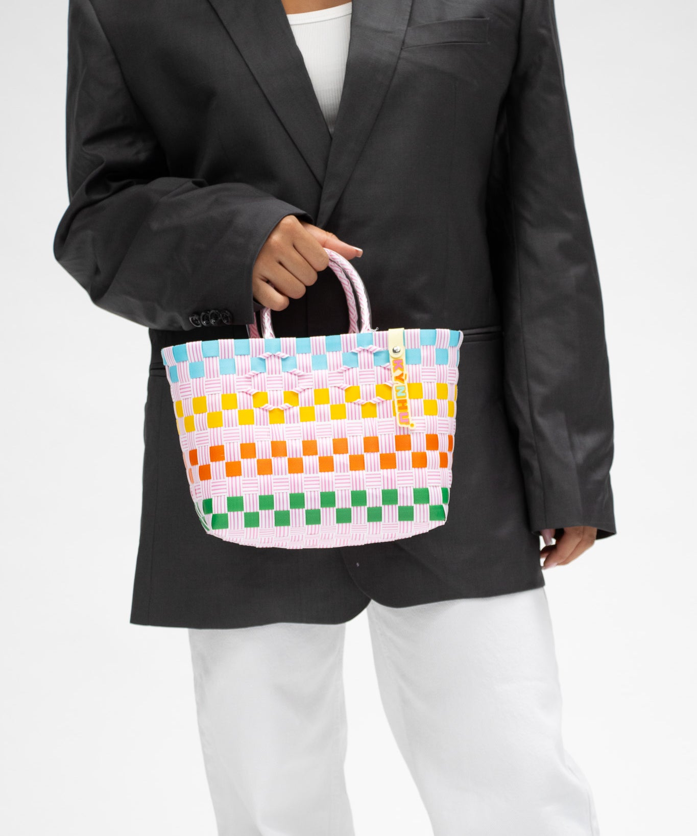 Détail du tressage coloré du panier Patchwork, mélange unique de motifs artisanaux, fait au Vietnam.