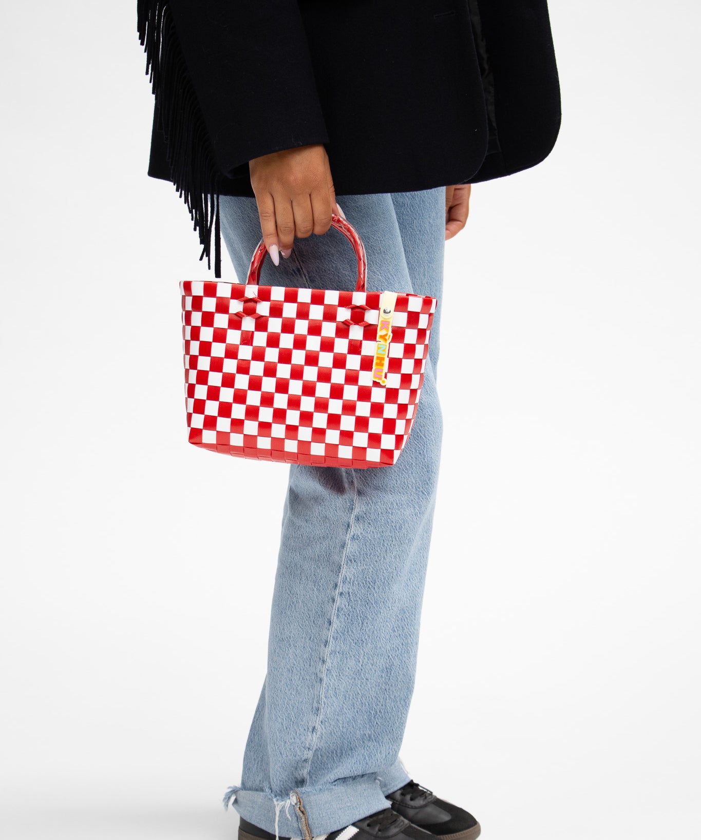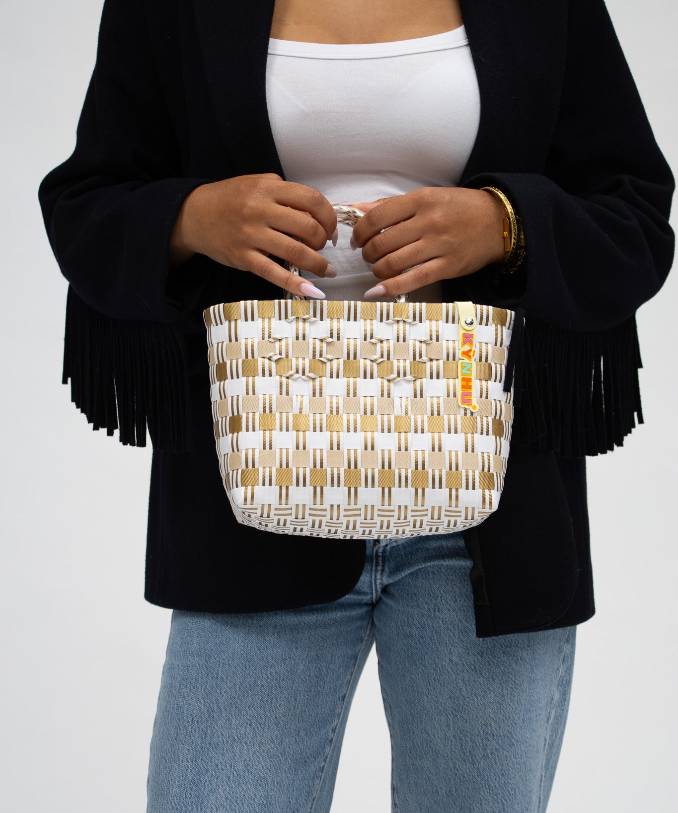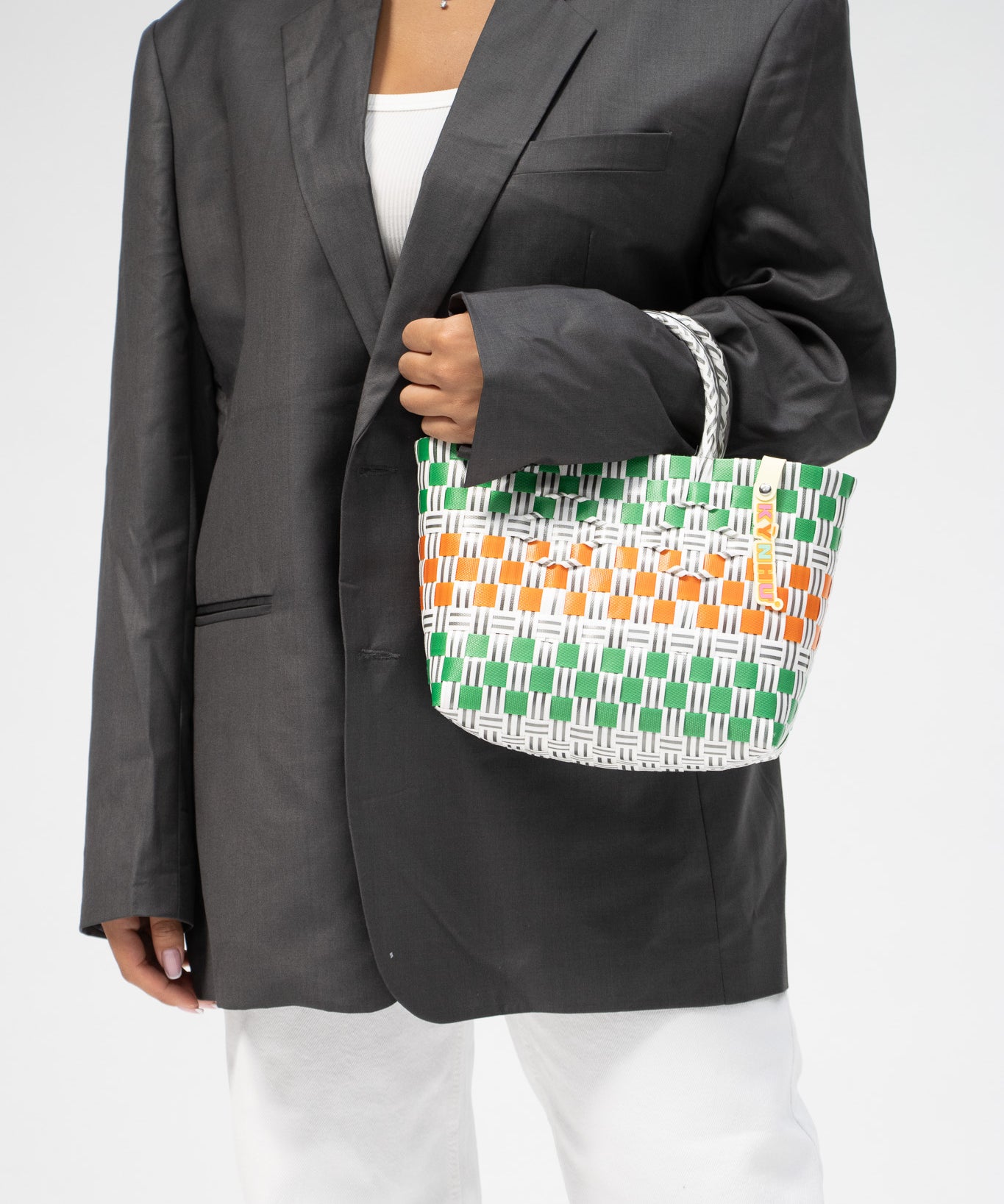 Détail du tressage coloré du panier Patchwork, mélange unique de motifs artisanaux, fait au Vietnam.